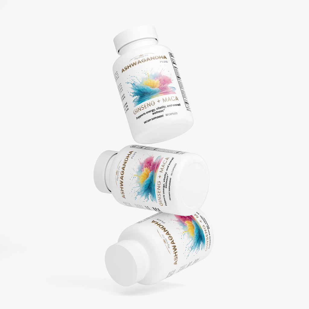 Ashwagandha Plus — KSM-66 Ashwagandha (600mg) with Vitamins B6, B12, and D3. 60 capsules per bottle. Vegan-friendly, no artificial additives. GMP certified, third-party tested.